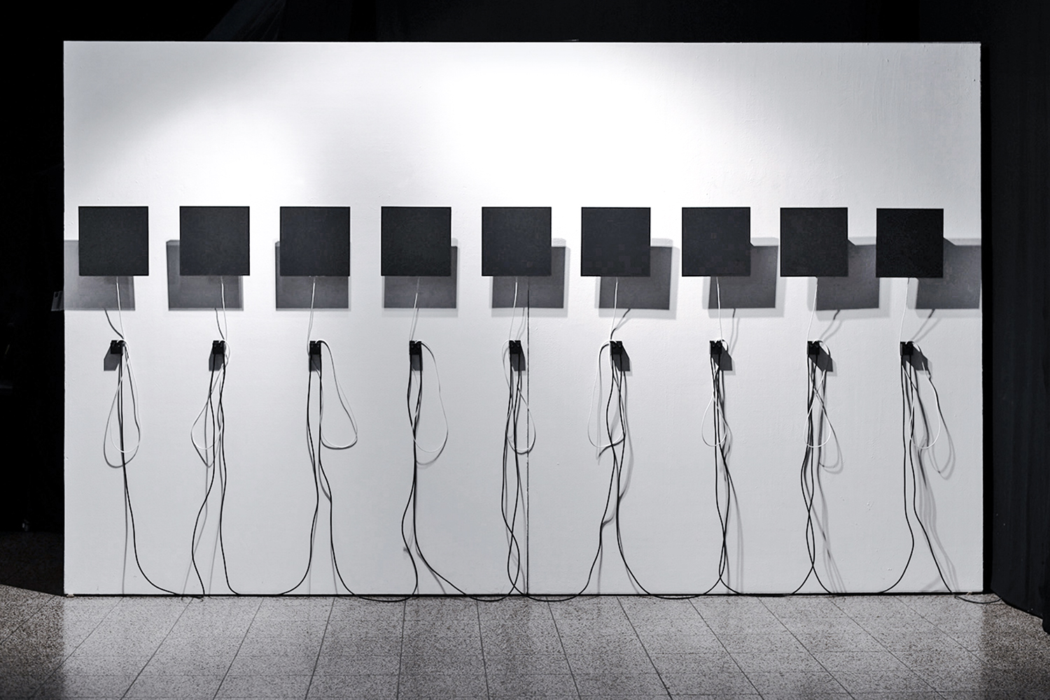 The installation’s second element is sound. Ten vibrating speakers mounted behind the panels play typical GPS commands such as “turn left” or “your destination is on the right.” Each board has one assigned command. When visitors approach, ultrasonic sensors trigger playback, creating a unique sound composition shaped by audience movement and presence.