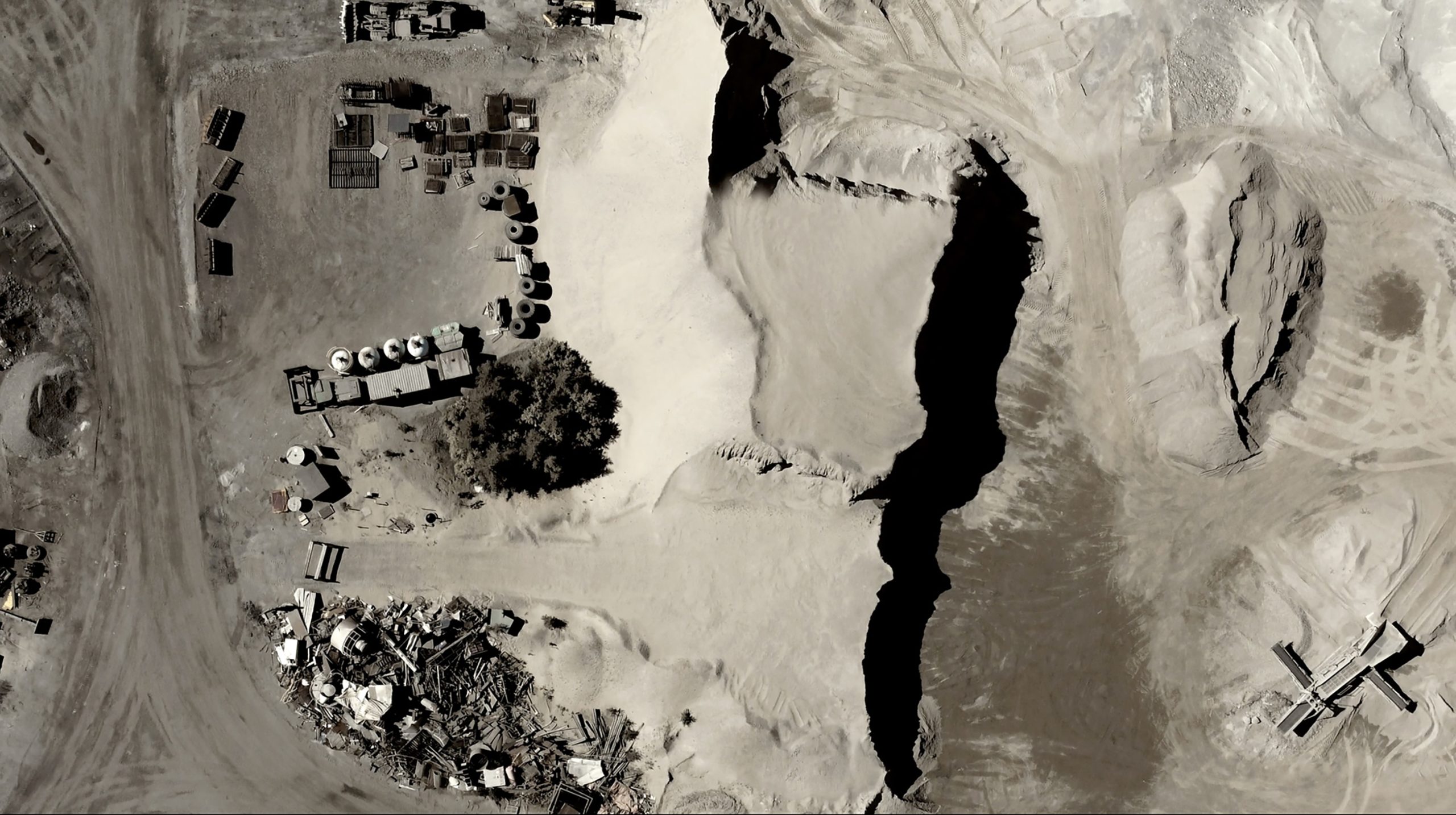 In the video Solid Landscapes, the artist “spells out” the never-ending growth of usable and productive (anti-)landscapes by reproducing and multiplying evidence of a dramatic change that is gradually taking place around the world. It is an allegory of societal processes that follow one another at an ever faster pace, mainly due to the dynamics of economic and population growth, technological advances and the ever-increasing flood of information. The flight over the monocultures of production begins with the ready-made components and goes deep into the pits where raw materials are mined to produce commodities. The viewer sees from a bird’s eye perspective an image that may be a piece of the Earth, but one cannot be sure whether it is reality or just a bad futuristic vision.