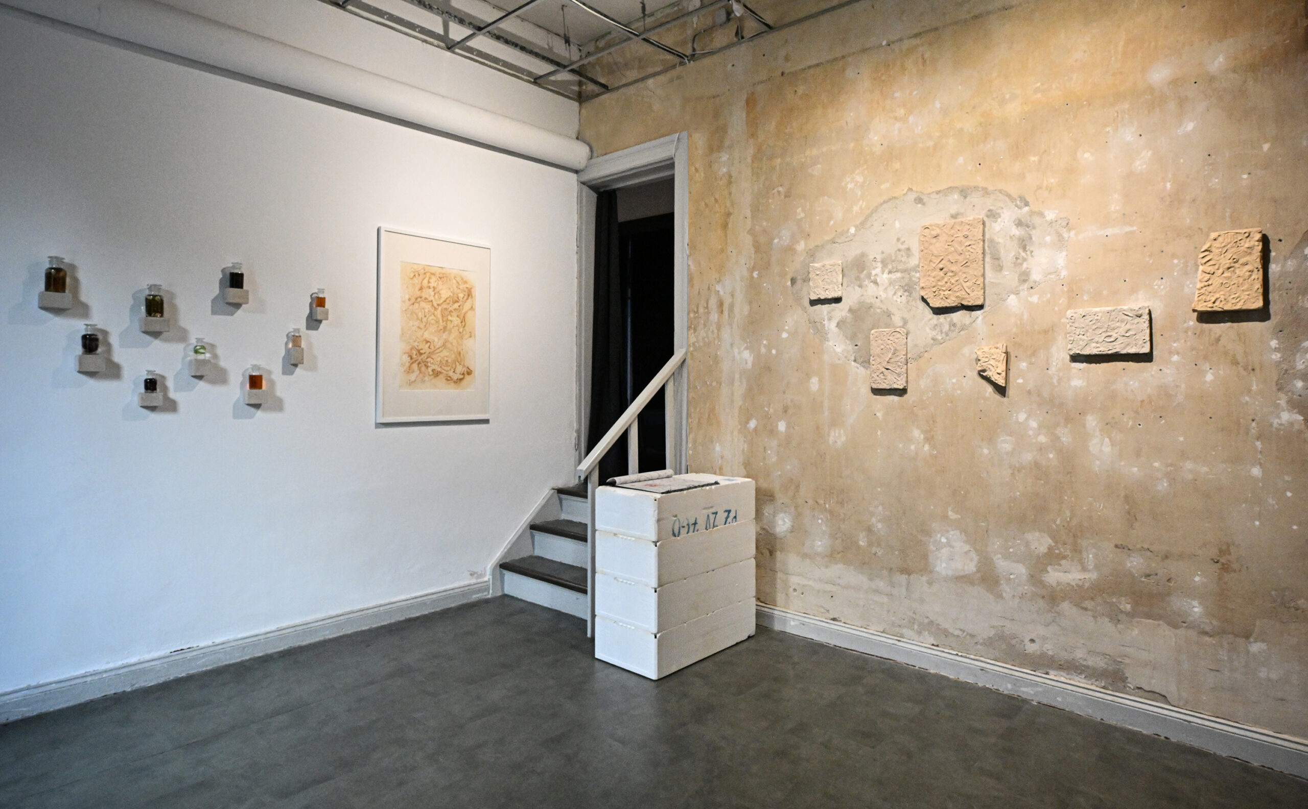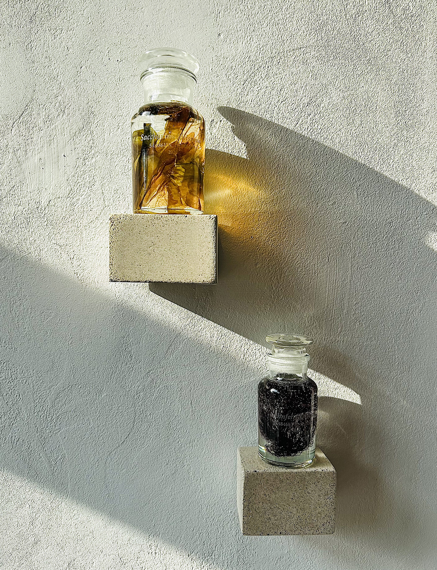“Herbarium Marinum”, variable sizes, reparations of marine plants, pigments from marine plants, engraved apothecary jars, pedestals: powdered seashells and cast