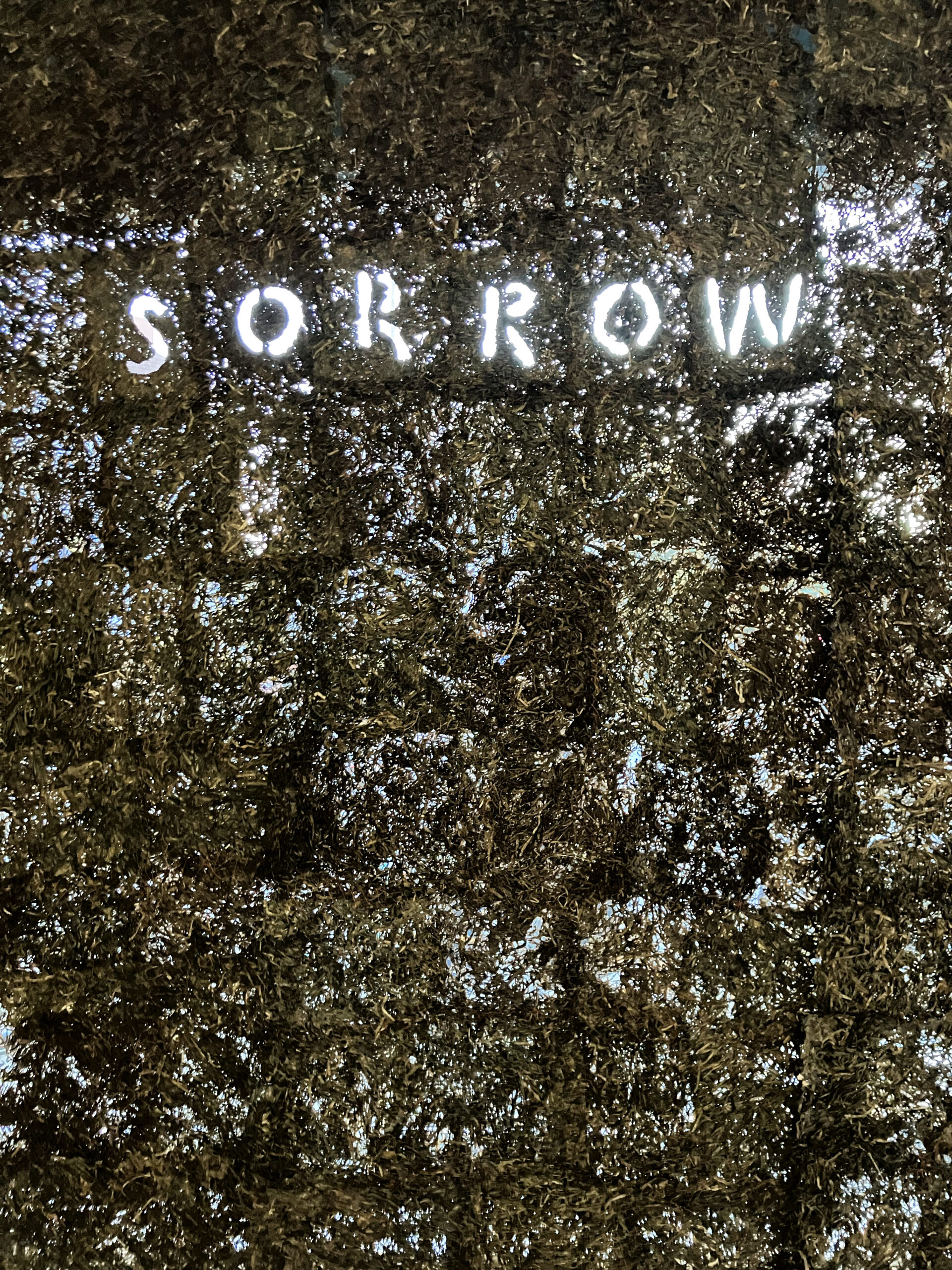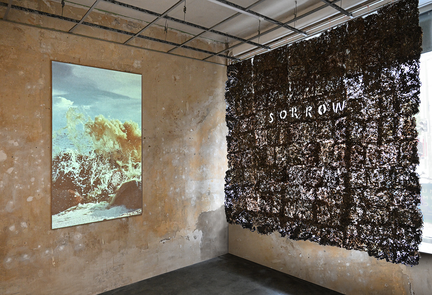 “Sea of Sorrow” , 270 × 250 cm, seaweed, fragments of fishing nets